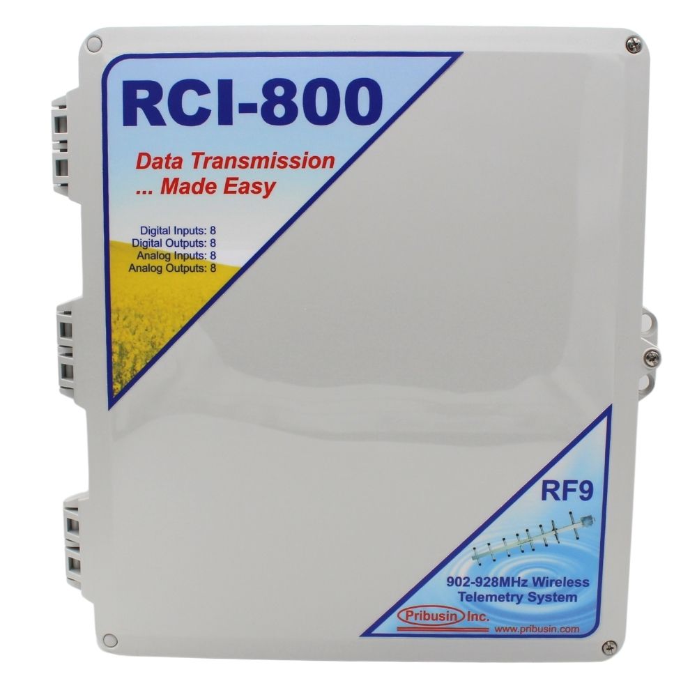 The RCI-800-RF9 is a bi-directional signal communication system that exchanges 8 analog (0-20mA) and 8 dry contact inputs between a master and a remote unit. A complete system consists of one master station and one remote station each with 8 analog inputs, 8 analog outputs, 8 dry contact inputs and 8 ‘C’ relay contact outputs. This means that signals can be retrieved from the remote site for monitoring purposes and that signals can be sent to the remote site for direct control functions.